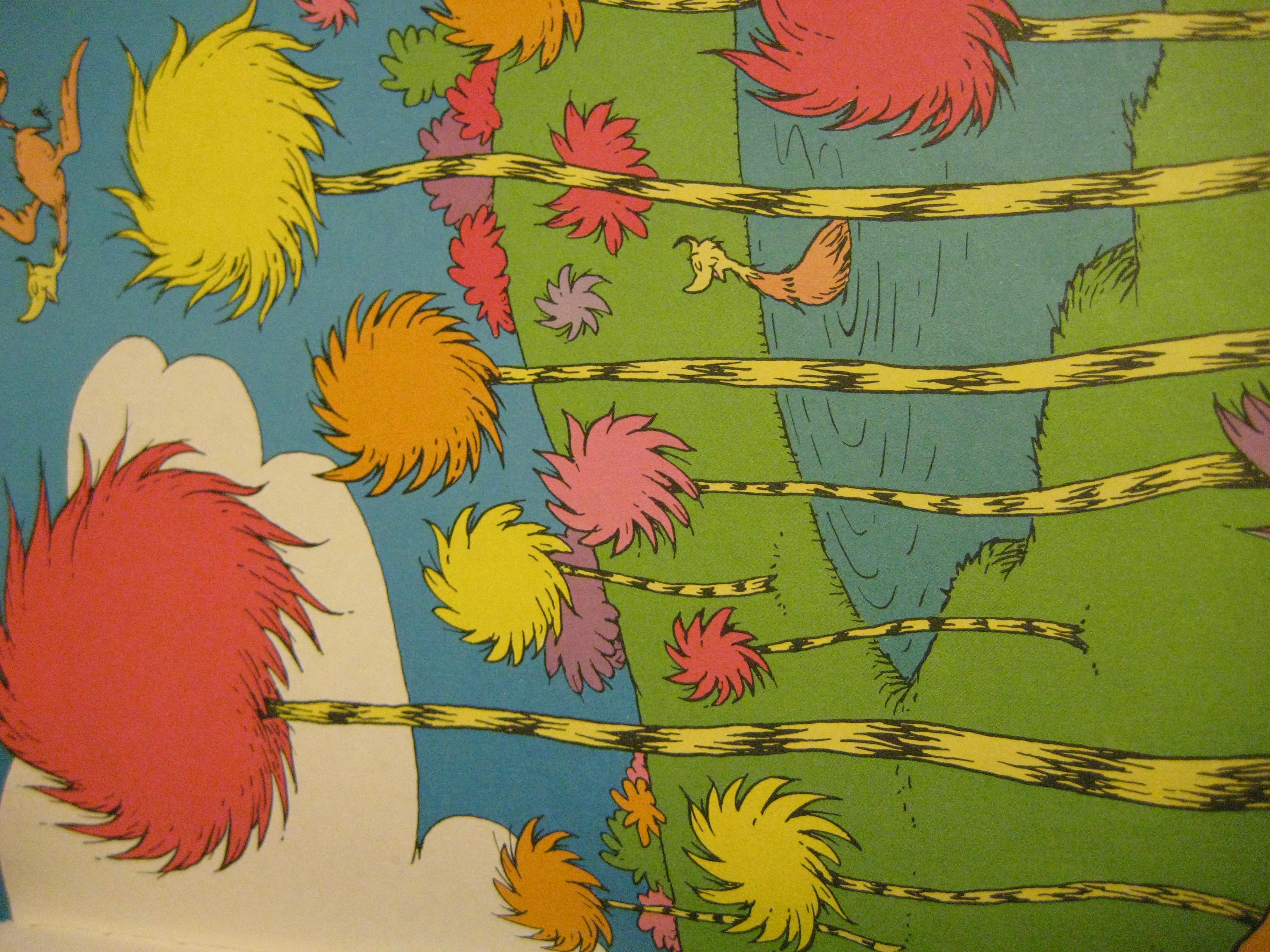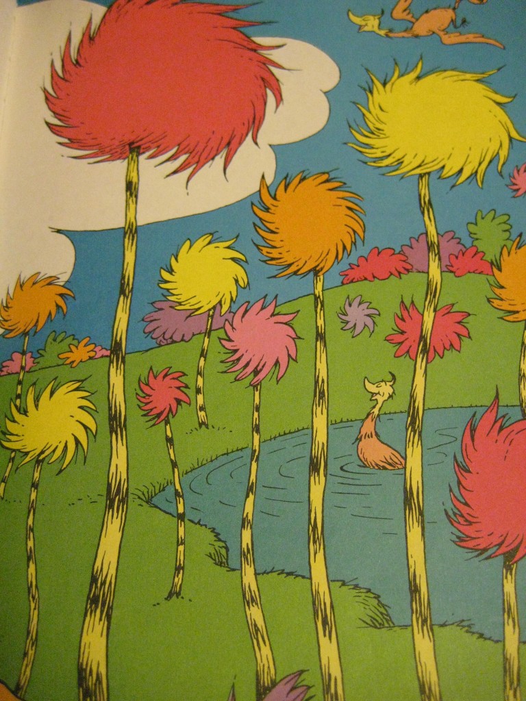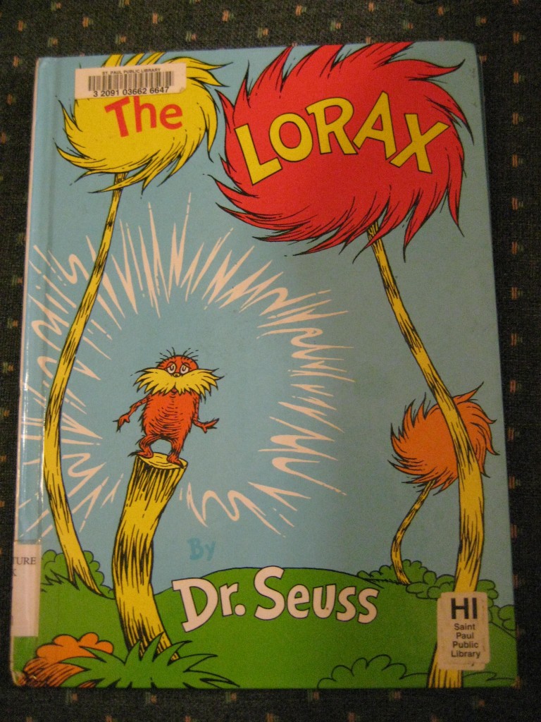 As I sat watching TV with man-go-round, a trailer came on the screen for the new movie “remix” of The Lorax. Now, if you’re like me you remember the beloved cartoon film, and read this book like it was going out of style. Man-go-round saw my eyes glued suddenly to the television (unlike my usual staring at my computer and forgetting to watch the television), and said, “we’ll have to go to that!” and then added, “I don’t know the story.”