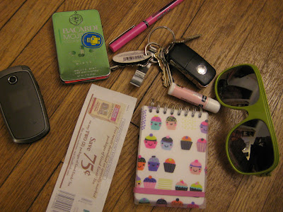| phone, coupons, notebook (for blog ideas and grocery/ library lists) sassy shades, chapstick, keys, pen, wallet! |