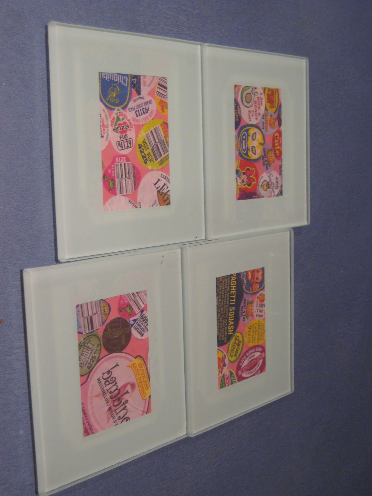 I had been collecting these stickers in our take-out menu folder for months now, and didn’t have a plan in place to use them. My a-ha moment was that they might be fun to display in the coasters, as they are food related.