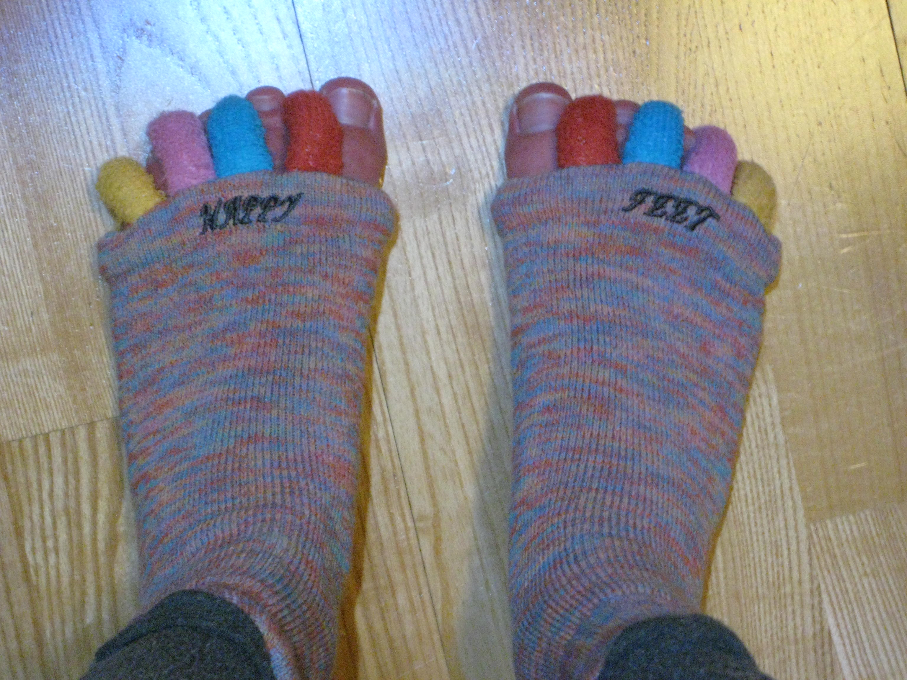 Hi everyone! What are these, you ask? Why, they are my Happy Feet Foot Alignment Socks! My momma gave me these for Christmas, and I’ve been (albeit with very poor consistency) trying them out since the beginning of the new year. I wanted to wait a few weeks before reporting on how they work so that I could give them a real chance.