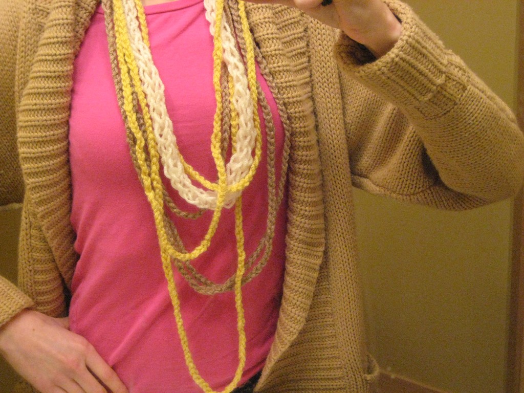 So I took out some of my yarn and got to work on these fabric necklaces (very kid friendly!):