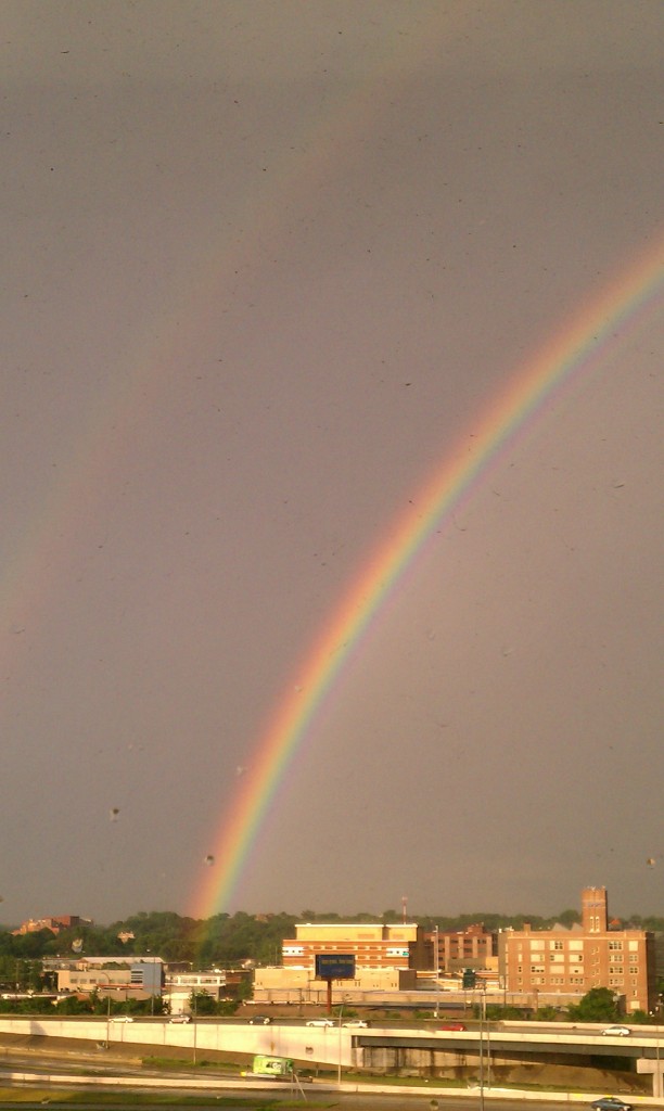 A few weeks ago, I was in the hospital just barely able to stand up by myself. As the sun neared the horizon and I was getting ready to settle back into my bed for awhile, man-go-round noticed something pretty special out the window- a double rainbow.