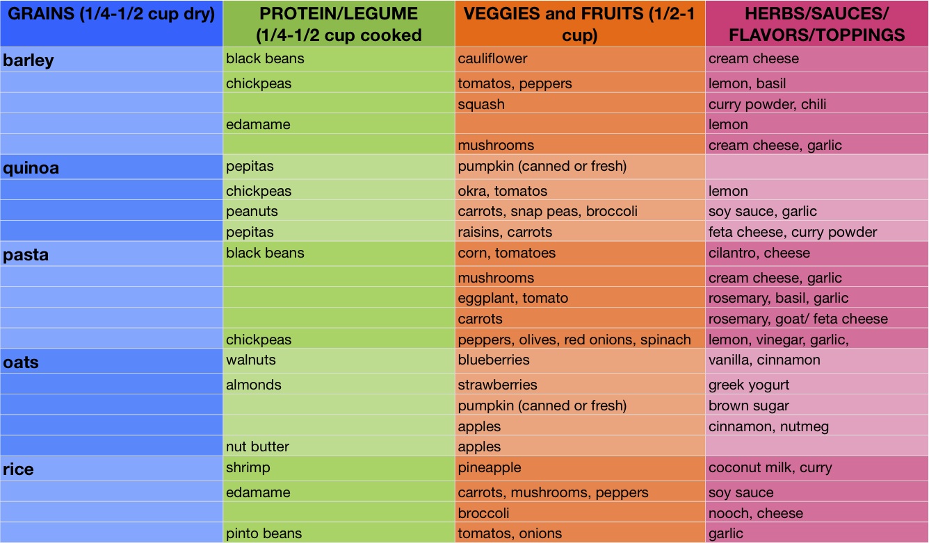 Since I often can get myself in a rut of eating the same things a lot (tortillas, veggie burgers, oatmeal, cottage cheese, repeat…) I thought I’d make myself a little spreadsheet to paste on the fridge and use as a reminder not to reach into the freezer every night. To get myself going, I started out with some of my favorite flavor combos