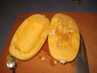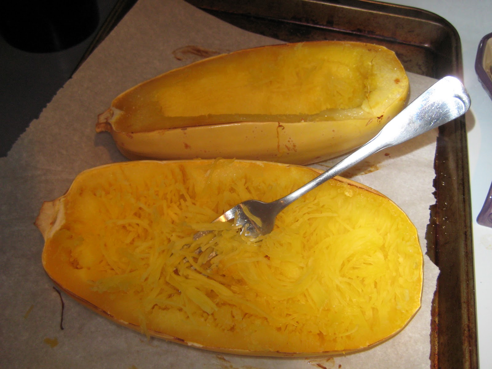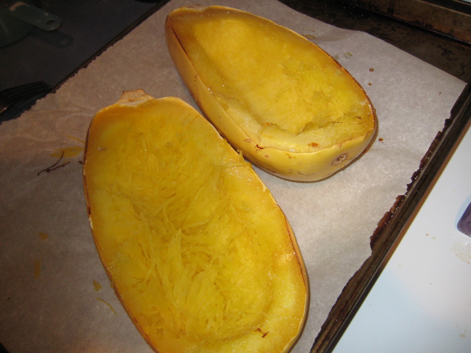 | et voila! spaghetti strands of squash to scrape out with a fork! bon appetit! |