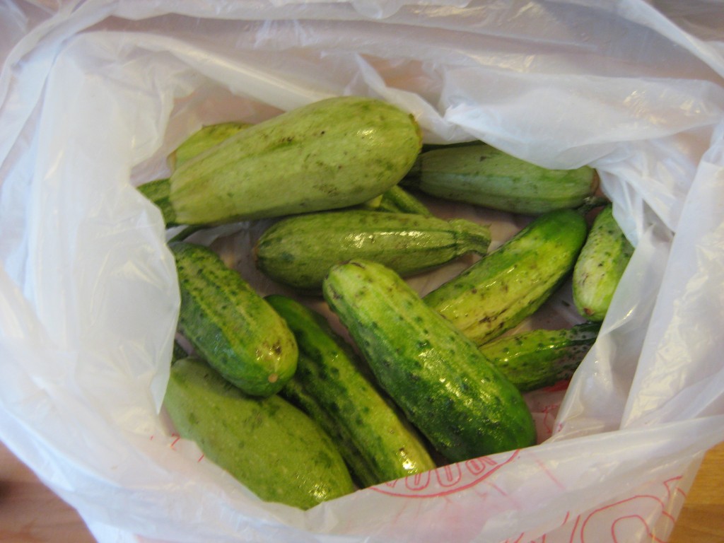 Well, we started out at a tiny farmer’s market in town that I’ve been meaning to go to, but usually… I am at work. I picked up some cute zucchini and pickling cukes: