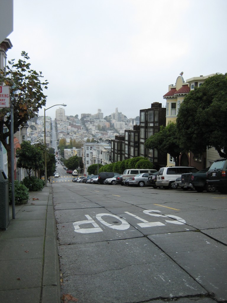 Now armed with umbrellas, the rain stopped. Through the leftover mist, we trudged north from our borrowed condo digs near the Ferry Building, up towards telegraph hill. We covered Coit Tower, Lombard Street, and some freaky deaky green parrots overlooking the bay. We had walked for at least a couple of hours now, and we were having a great time. Happy, but in need of a break and a warmer upper from the foggy damp air.