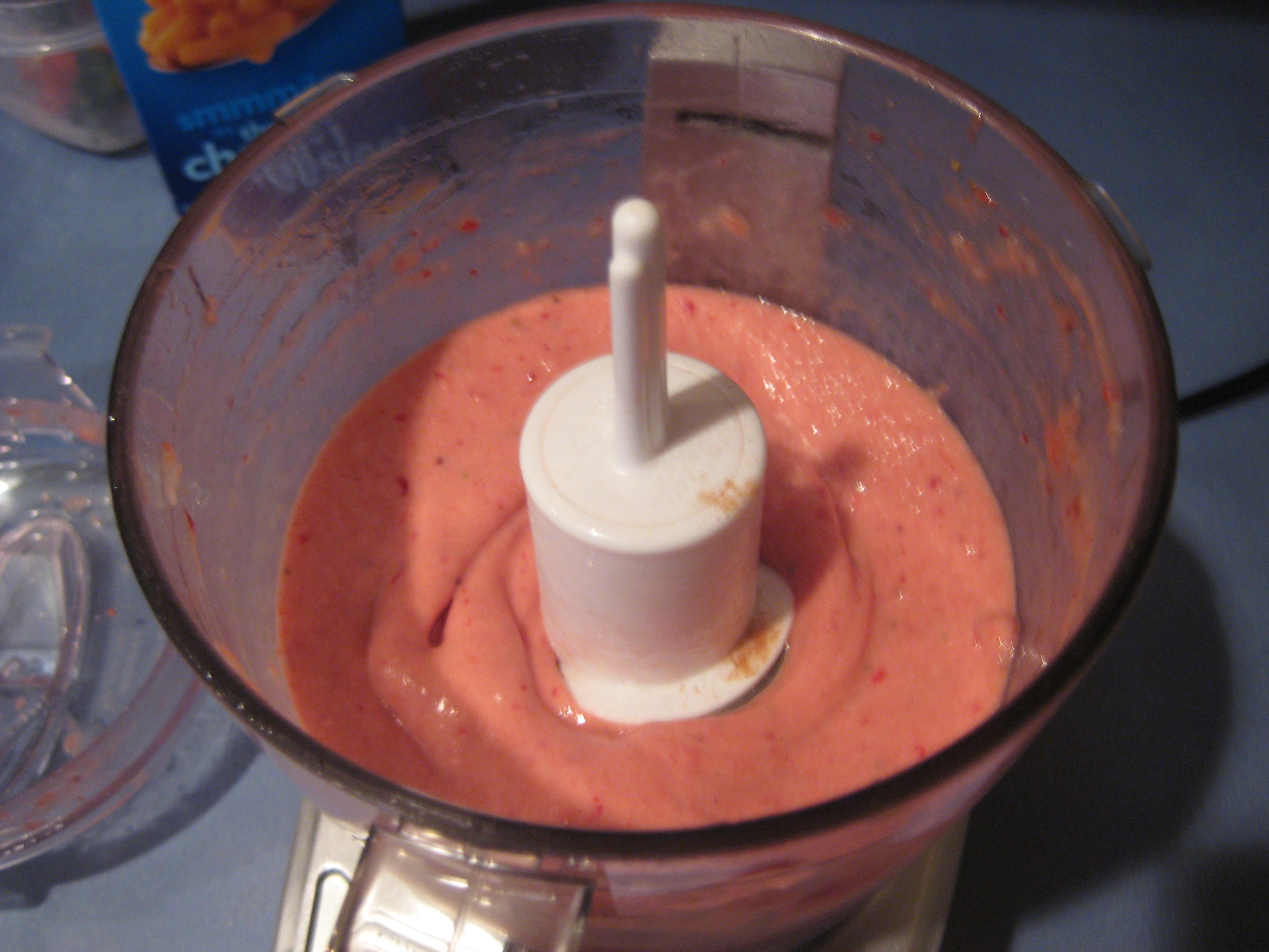 First off, bananas. I can barely stomach bananas on a regular day, so I knew I would have to whip up some “bananarama” as I call it, or pureed frozen banana chunks, also known in some circles as “banana soft serve.” Usually I would add all kinds of “fixings” like peanut butter or m&ms or more fruit, but today I kept it simple with just a dash of cinnamon. (pictured below- strawberry soft serve from a different day when I had the energy to photograph my food for y’all…)